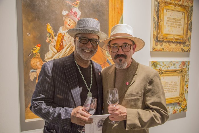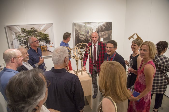 Seattle gallery owner, Greg Kucera (seen here in plaid jacket), entertains guests within his booth at the 2016 Seattle Art Fair.