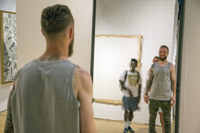 Seattle Sounders goalkeeper Stefan Frei views "Blue Mirror" by Random International within Pace Gallery's booth at the 2016 Seattle Art Fair.