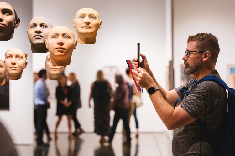 A visitor taking a photo of Heather Dewey Hagborg's "Probably Chelsea"