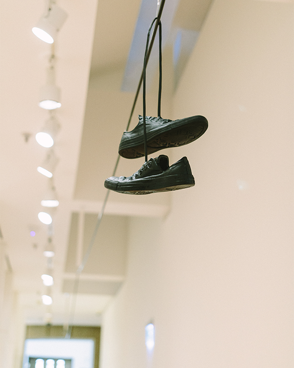 Entering the exhibition at the Frye, viewers are immediately met by a pair of bronze cast sneakers hanging over a coated cable. The shoes have dual meaning, according to the Frye’s curator Amanda Donnan.