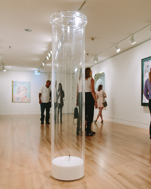Farther into the exhibition, an enormous votive candle stands in the middle of the room. Frequently used by Catholics to honor saints, votive candles were iconic to Aranda’s childhood growing up with his mother and grandmother.