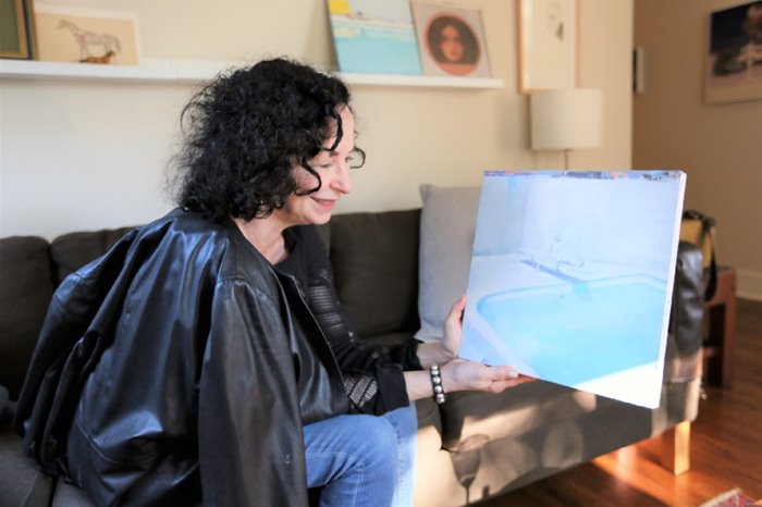 Hodges admires Duffus's painting. At Seattle Art Fair, her booth will feature works from artists grounded in storytelling.