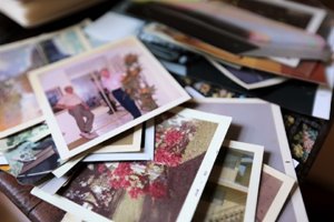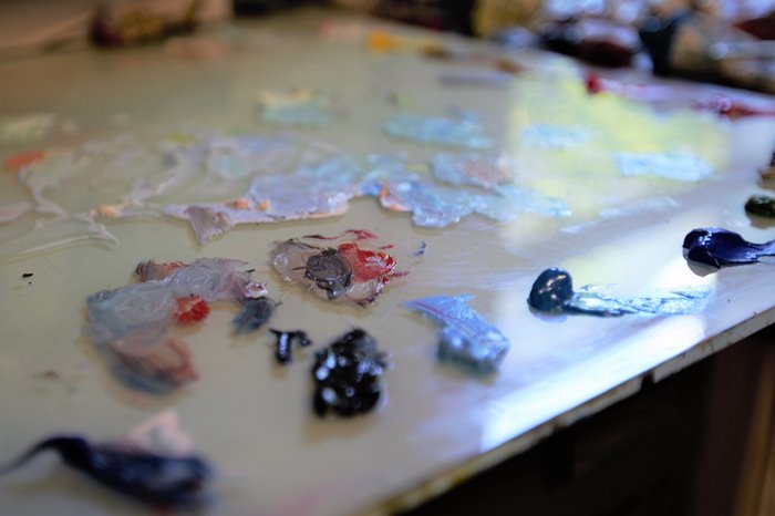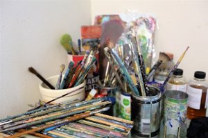 Duffus's studio houses collections of found photos, paintbrushes, and other paint supplies.